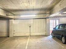 Autopaikka puolilämpimässä autohallissa ensimmäisessä kerroksessa. Lämmitystolpassa asennettuna valmius sähkölatauspisteelle.