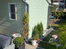 - Rakennuksen ulkopinta on vinyylilevyä. Runkona on puurunko.