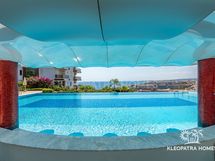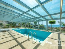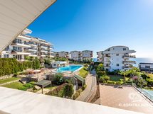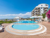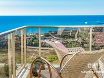 Olohuoneen tilavalta kulmaparvekkeelta aukeaa ihanat maisemat kimmeltävälle Välimerelle. Ihastele kuvan kauniita auringonlaskuja omalla parvekkeella! Ilta-aikaan maisema on eläväinen ja kaupunkimainen rannikon ja Konaklin keskustan valojen syttyessä.