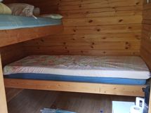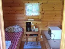 Tontin perällä suojaisemmalla alueella kaksi pientä nukkumispaikoilla varustettua mökkiä joissa sähköt