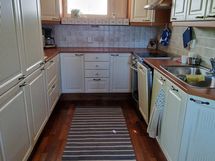 - Keittiön varusteet: Liesi, jääkaappipakastin, liesituuletin ja astianpesukone. Liesi: Keraaminen liesi. Työtason materiaali: Laminaatti.