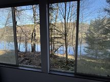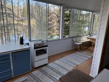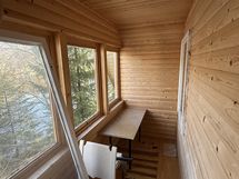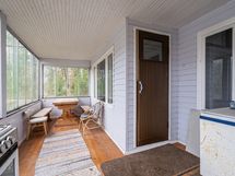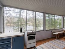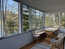 Asunnossa on terassi. Lasitettu terassi. Lasitettu terassi, josta näkymä järvelle