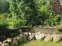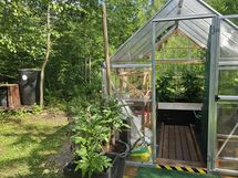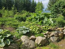 • Harkittu kokonaisuus: Monivuotisia istutuksia, kasvihuone, polkuja, erilaisia "pihoja"