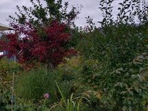 Paljon hedelmäpuita, marjapensaita, ruusupensaita ja perennoja.