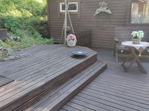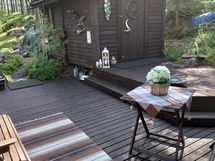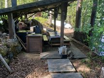 Pihapiirissä työkaluvaja, grillikatos ja puucee.