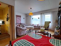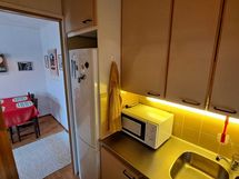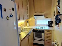 - Keittokomero, jääkaappipakastin, sähköliesi, liesituuletin (hormiliitäntä), keittiökaapistot ja -tasot. Ruokailutila: Olohuoneessa tila ruokailuryhmälle.