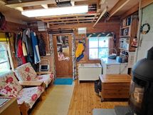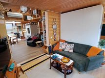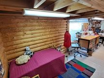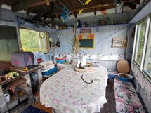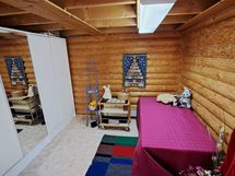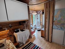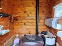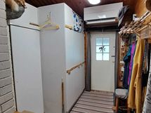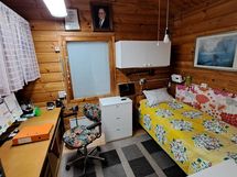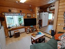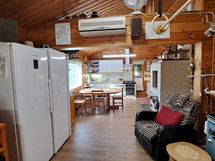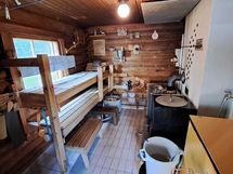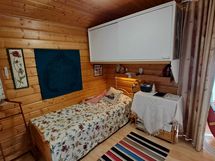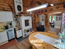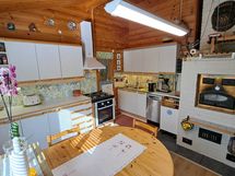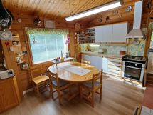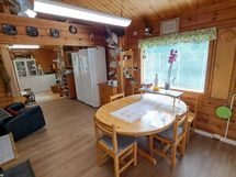 Pintamateriaalit: lattia vinyylilankku, seinät hirsipaneeli, katto paneeli (viisto sisäkatto). Ruokailutila: Keittiön yhteydessä tilaa reilunkokoiselle ruokailuryhmälle.