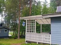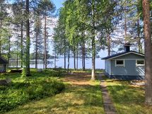 Mökkitontti on kaunis pienine sinisine rakennuksineen ja siellä on rauhallista. Naapureita on vain toisella puolella ja pidemmän matkan päässä viereisen niemen kärjessä. Mökki on todellinen taivas ulkona viihtymiseen ja terassilta järvimaiseman ihailuun!