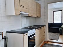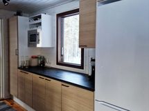 Paljon kaappitilaa, Paljon työskentelytilaa, Suuri tiskipöytä, Teräskalusteet, Laminaattitasot, Sähköliesi, Keraaminen liesi, Liesituuletin, Jää-pakastinkaappi, Tilaa isolle ruokapöydälle