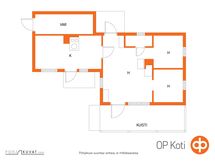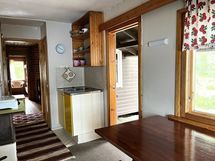 - Keittiössä on kaasuliesi, jääkaappi, kaapistoja ja vanha puuhellakin levyn alla. Puuhellaa ei ole käytetty vuosiin eikä sen toimintakunnosta ole tietoa.