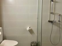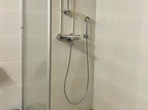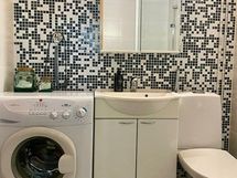 Suihku, Suihkuseinä, Pesukone, Kuivauskaappi, Peilikaappi, Allaskaappi, Laattalattia, Avattava ikkuna, Lattialämmitys