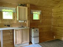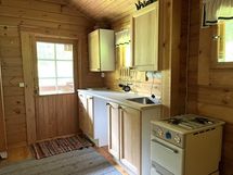 Keittiösyvennyksessä kaapistoja, tiskipöytä ja kaasulla toimiva hella. Kaasuhellan kunnosta ei ole tietoja.