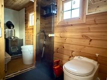 - Pesutilojen kuvaus: Saunatila, jossa kiukaan yhteydessä lämminvesisäiliö. Saunan lattia levyä, seinät hirsi. . Erillisen WC:n kuvaus: Mökissä on polttava cinderella comfort WC, josta savut johdettu ulos katolle.
