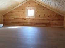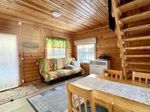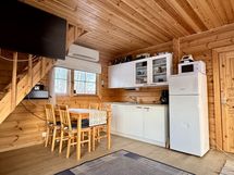 - Keittiönurkkaus, jossa kaapistoa, tiskipöytä. Käytössä on ns. mökkihana, jossa myös varaaja. Varusteena jenkkikaappi. Lattia laminaattia, seinät hirsi. Tilassa ilmalämpöpumppu.