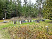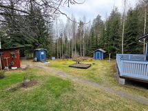 Pihapiirissä sijaitsevat lisäksi aitta, varasto ja kompostoiva puucee. Pihamaalla on kauniita istutuksia, nurmialuetta ja hyvin hoidettu sorapiha, johon mahtuu useampi auto. Kiinteistöllä on sähkölämmitys, varaava takka ja ilmalämpöpumppu, jotka mahdollistavat mökkeilyn pitkälle syksyyn. Vesipiste on tuotu myös sisätiloihin, ja saunalle tulee vesi omasta kaivosta.