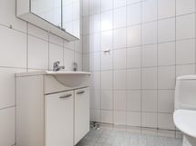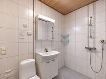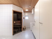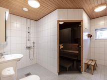 - Kylpyhuone: suihku, pesukoneliitäntä, kaapistot, alla ja allaskaappi, peilikaappi, latttialämmitys, kiinteät valaisimet. Erillinen wc: wc-istuin, allas ja allakaappi, peilikaappi. ja kiinteät valaisimet. Sähkösauna.