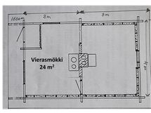 Vierasmökki: 24 m2 (tupakeittiö ja kamari, kuisti), makuutilat 4 - 5 hlö:lle. Mökkien pinta-alat rakennuslupien mukaisia.