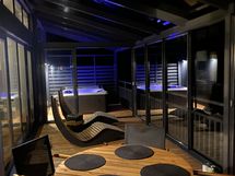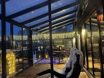 Lasitetulla terassilla on kokoa 30 m2 ja siltä löytyy käytössänne oleva ulkoporeamme, ruokailuryhmä ja lepotuolit sekä kaasugrilli.