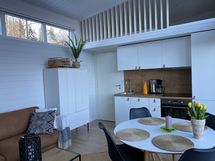 Tupakeittöstä löytyy jääkaappipakastin, induktioliesi, uuni, astianpesukone, mikroaaltouuni, kahvinkeitin, vedenkeitin, leivänpaahdin, pannut, kattilat, ruokailuvälineet, astiasto, keittiötarvikkeita.