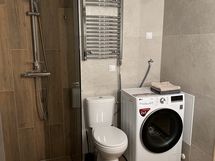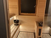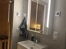 Kylpyhuoneessa on wc, suihku, kuivaava pyykinpesukone, sähköinen pyyhekuivain. Tilassa on lattialämmitys. Sauna on sähkökiukaalla ja sälekaihdin ikkunassa.