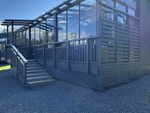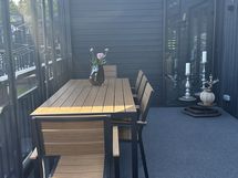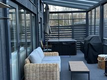 Lasitettu terassi 32 m2, jossa on poreamme sekä Idecan asentama terassimatto. Ulkoseinässä on myös vesipiste.