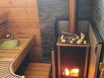 Sauna puukiukaan pehmeillä löylyillä. Lauteilta näkymä Pyhäjärvelle.