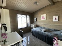 Talossa on 3 varsinaista makuuhuonetta, joihin jokaiseen mahtuu iso parisänky, pöytä, kaapistot ym. Lisäksi työ-/toimistotila, johon mahtuu norm. toimistokalusteiden lisäksi esim. kerrossängyt. Tähän tilaan on oma sisäänkäynti myös ulkoa. Makuuhuoneissa sähköiset pimennyskaihtimet ikkunoissa. Kaksi suihkuhuonetta (suihkukaapit), joista toinen suihkukaappi on myös ns. ”höyrysauna” ja WC:t. Toisessa suihkuhuoneessa lisäksi poreamme. Pyykinpesukone ja kuivausrumpu toisessa suihkuhuoneessa.