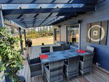 Rannan puolella iso valokatteella katettu terassi, pihakäytävät takana kyllästettyä puuta ja suojattu erikseen harmaan värisellä terassiöljyllä.
