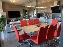 Kaikki lattiat isoa kivilaattaa, täydellinen keittiökalusto induktioliesineen ja ast.pesukoneineen. Keittiökoneet väriä teräs. Keittiö ja iso oh yhtä tilaa. Jokaisessa huoneessa antenniliitännät, internet-kaapeliyhteys ja wlan.