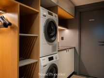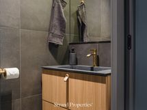 - Pesutilojen kuvaus: Kylpyhuoneet asunnon molemmissa kerroksissa. Alakerran kylpyhuoneen lattialaatta jäljittelee tammilattiaa. Yläkerran kylpyhuoneessa harmaasävyiset laatoitukset ja spa-henkinen kiviallas . Molempien kylpyhuoneiden yhteydessä wc.