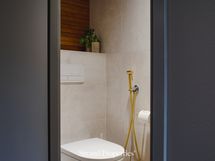Alakerran kylpyhuoneen kaapistossa Mielen pyykinpesukone sekä kuivausrumpu. Varustus: suihkuseinä, wc-istuin, peili, kiinteät valaisimet, kylpyhuonekaapisto. Erillisen WC:n kuvaus: Ensimmäisessa sekä toisessa kerroksessa erilliset wc:t, yläkerran wc:n yhteydessä suihku. Varustus: lattialämmitys, lattiakaivo, suihku, suihkuseinä, bidee-suihku.