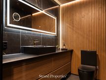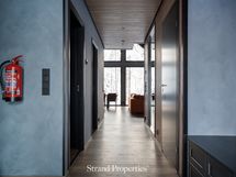 Toisen kerroksen master bedroomista avautuu näyttävä näkymä lasiseinän läpi oleskelutilaan, mikä lisää avaruuden tuntua ja antaa tilalle persoonallisen ilmeen. Keittiö on varustettu integroiduin kodinkonein, ja saarekkeessa on suodattimella varustettu liesituuletin. Runsaat työskentely- ja säilytystilat palvelevat niin arjen ruoanlaittoa kuin suurempien illallisten järjestämistä. Tilava kodinhoitohuone tarjoaa erinomaiset puitteet pyykkihuollolle ja ulkoiluvarusteiden kuivatukselle.