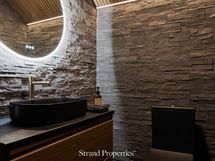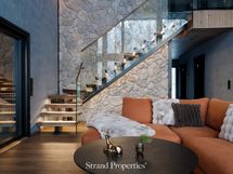 Sisustussuunnittelussa on yhdistetty kiveä ja puuta hallitusti ja laadukkaasti. Materiaalivalinnat, sävyt ja yksityiskohdat luovat luonnonläheisen mutta modernin ja hienostuneen tunnelman. Huolellisesti toteutettu valaistussuunnittelu korostaa arkkitehtuuria ja tuo tiloihin kerroksellisuutta eri vuorokaudenaikoina. Myös takapihan puusto on maisemavalaistu, mikä viimeistelee tunnelman ilta-aikaan.