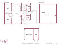 Kerrosala 90,8m2: 1.kerros 81m2, parvi 9,2m2. Huoneistoala 76,5m2: 1.kerros 67,5m2, parvi 8,9m2. Varasto 2m2. Autokatos kerrosala 15m2, huoneistoala 11,5m2. Pinta-alat rakennuspiirustuksista.