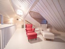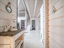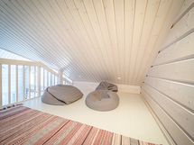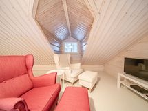 Mökissä alakerrassa tilava keittiö-olohuone, kaksi makuuhuonetta, sauna-kylpyhuone-pukuhuone -osasto, pukuhuoneesta käynti suoraan terassille. Erillinen wc. Parvella reilusti oleskelu-/nukkumatilaa. Mökin yhteydessä varasto, johon on käynti terassilta.