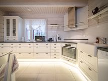 Liesi: integroitu, erillisuuni. Työtasot: laminaatti. Kylmäsäilytys: jääkaappi/pakastin. Varustus: liesituuletin, astianpesukone.