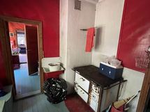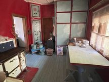 Lattia: Keittiössä: lauta. Pesutiloissa: lauta. Seinät: Keittiössä: tapetti. Pesutiloissa: puu.