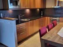 Tilaa isolle ruokapöydälle, Paljon kaappitilaa, Suuri tiskipöytä, Puutasot, Teräskalusteet, Astianpesukone, Sähköliesi, Induktioliesi, Liesikupu, Liesituuletin, Pesukoneliitos, Jääkaappi, Pakastin