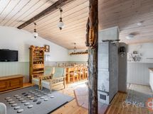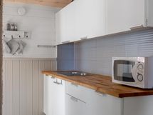 Jääkaappipakastin, sähköliesi, leivinuuni, mikroaaltouuni, kaapistot, kiinteät valaisimet, pöytätasojen materiaali puu.