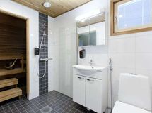 Suihku, Pesukone, Kuivauskaappi, Suihkuseinä, Laattalattia, Laattaseinä, Peilikaappi, Rättipatteri, Lattialämmitys