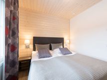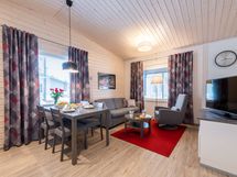 Tyylikäs ja valoisa loma-asunto, jossa kaksi makuuhuonetta, tupakeittiö, kylpyhuone, sauna ja wc.