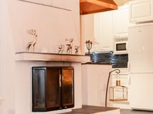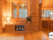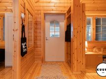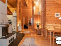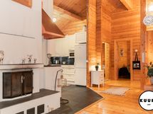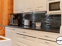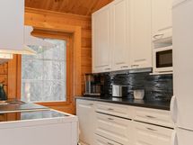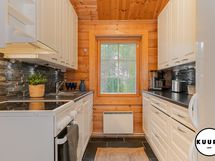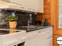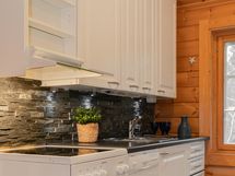 - Keittiön varusteet: Jääkaappipakastin, liesi, uuni, mikroaaltouuni, liesituuletin ja astianpesukone. Liesi: Keraaminen liesi ja puuhella. Työtason materiaali: Laminaatti. Keittiössä on vaaleat kaapistot, jotka tarjoavat säilytystilaa ja selkeän ilmeen. Seinäpinnat ovat puuta, mikä tuo tilaan luonnonläheistä tunnelmaa.