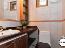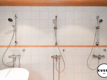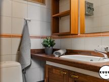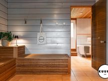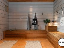 Alakerrasta löytyy kolme tilavaa makuuhuonetta, kolme wc:tä, avara ja valoisa olohuone, ruokailutila sekä laadukkaasti varusteltu keittiö, joka soveltuu myös vaativampaan ruoanlaittoon. Lisäksi alakerrassa on komea saunaosasto, johon kuuluu oma reilun kokoinen pukuhuone, pesuhuone kahdella suihkulla ja kylpyammeella sekä tilava sauna. Saunan panoraama ikkunasta avautuu upea näkymä Juhannuskalliolle, ja löylyt ovat pehmeät myös suuremmalle seurueelle.