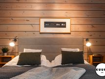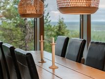 Päivisin valo tulvii sisään ja korostaa avarien tilojen tunnelmaa, iltaisin harjunrinnettä valaisevat pehmeät led-valot, jotka tuovat esiin maiseman jokaisen yksityiskohdan – männynrunkojen kaaret, lumen peittämät puut tai syksyisen ruskan hehkun. Näin vaikuttavaa ja avaraa näkymää ei ole tarjolla kuin harvoissa paikoissa edes Rukan seudulla.