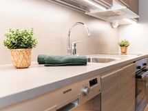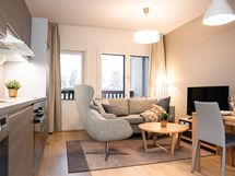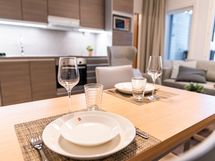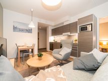 - Keittiön varusteet: Mikroaaltouuni, astianpesukone, uuni, liesi, liesituuletin ja jääkaappi. Liesi: Keraaminen liesi. Työtason materiaali: Laminaatti. Hyvin varusteltu keittiö on toimiva ja selkeä kokonaisuus, jossa arki ja loma sujuvat vaivattomasti. Täällä on helppo aloittaa päivä rauhallisella aamupalalla ennen rinteisiin tai kylälle lähtöä. Avoin tunnelma sopii myös rennolle kokkailulle ja yhdessäololle illan tullen. Uudehko ilme ja fiksu tilankäyttö tekevät keittiöstä mukavan paikan viettää aikaa.