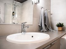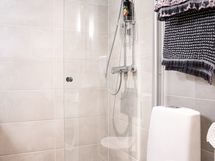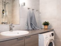 - Pesutilojen varusteet: WC-istuin, suihku, suihkuseinä, pesukoneliitäntä, pesukone, lattialämmitys, pesuallas, peili ja allaskaappi. Pesutilojen kuvaus: Harmonisen sävyinen pesuhuone on siisti ja selkeä kokonaisuus, jossa on kaikki tarpeellinen kompaktisti yhdessä. Suihkun yhteydessä oleva wc-istuin pitää tilaratkaisun järkevänä ja vapauttaa asunnon muut neliöt oleskeluun. Pesukone tuo arkeen helppoutta ja tekee pidemmistäkin lomista huolettomampia. Kokonaisuus on moderni ja helposti pidettävä, juuri sopiva vaivattomaan lomailuun.