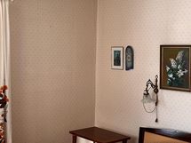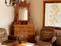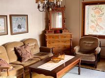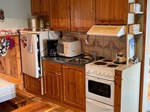 - Jääkaappi, sähköliesi, kaapistot (mäntyovet), liesituuletin/ aktiivihiilisuodatin, varaava takka. Lattia: Muovi. Seinät: Maalattu, puolipaneli