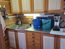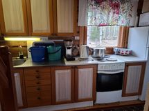 Tilaa isolle ruokapöydälle, Suuri tiskipöytä, Laminaattitasot, Paljon kaappitilaa, Sähköliesi, Jenkkikaappi