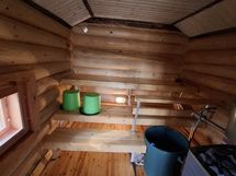 Sauna rakennettu 2000. Pyöröhirsi, noin 10 m2, josta kuistin osuus n. 4 m2. Puukiuas. Ulkohuussi.