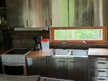 Suuri tiskipöytä, Puutasot, Teräskalusteet, Keraaminen liesi, Jää-pakastinkaappi